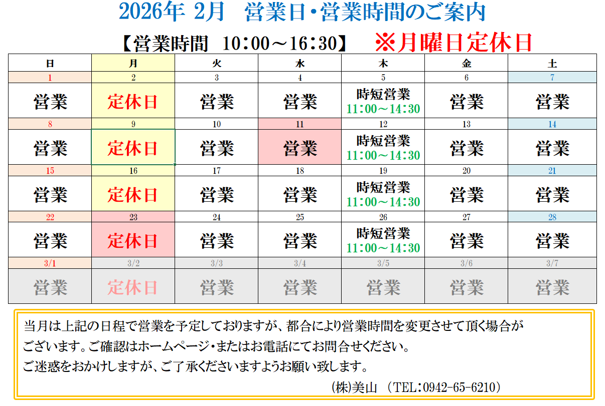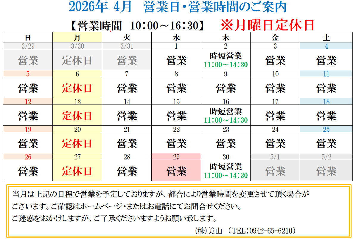 - 誠に勝手ながら、11月22日(土曜日)の営業時間を10:45~とさせていただきます。 ご迷惑をおかけいたしますが、ご了承くださいますようお願いいたします。